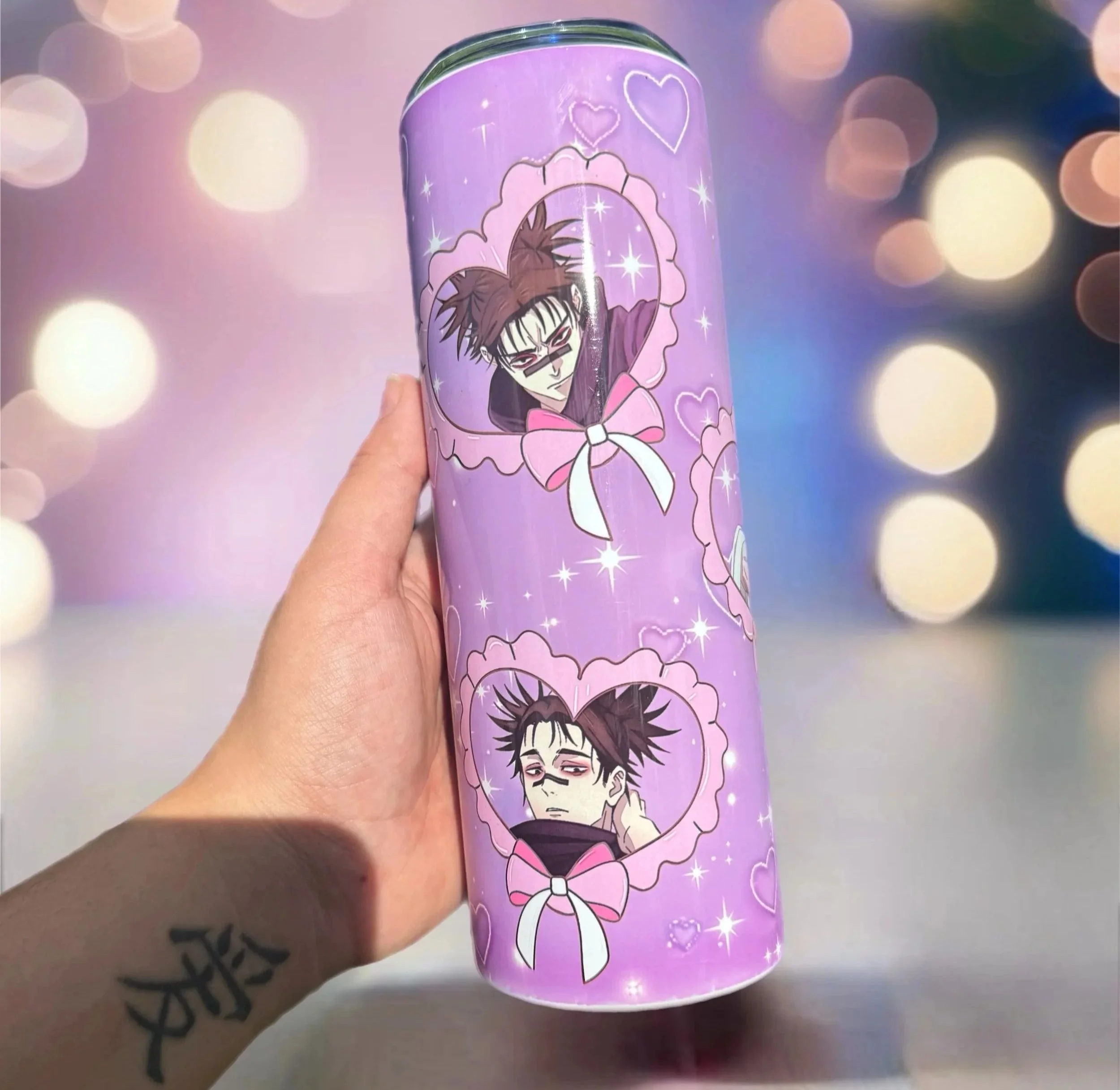 Text in bold black letters says "Stainless Steel Tumbler" with a light pink background and small black starburst shapes scattered across the background.